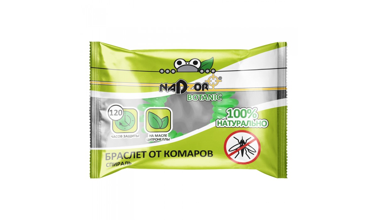 Браслет в виде спиральной резинки. Основной материал - EVA. Предназначен для защиты взрослых и детей (с 3 лет) от нападения комаров. Материал, из которого состоит браслет, пропитан натуральным маслом цитронеллы. Масло цитронеллы характеризуется ярким пряным ароматом, напоминающим запах лимона. Действие соединений эфирного масла забивает рецепторы комаров и мошек и маскирует другие привлекательные для насекомых ароматы, затрудняя поиск своих жертв. Защищает не менее 120 часов.