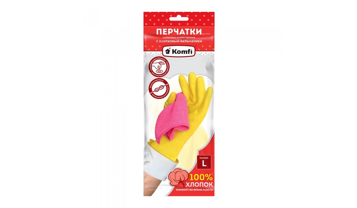 Перчатки хозяйственные латексные с х/б напылением желтые L Komfi, 12 пар/уп